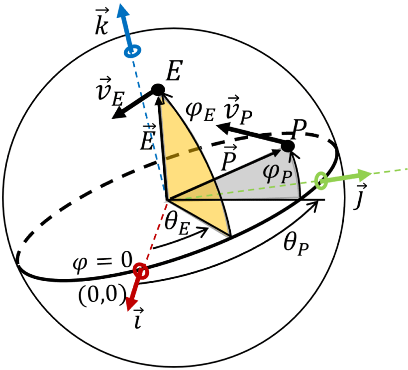 Pursuit-evasian (P-E) of a pursuer (P) and a slower evader (E) on a sphere.