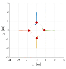 Four drones fly toward a central collision point. Upon detecting each other’s presence at the red dots, they identify a potential collision, trigger the algorithm, and execute a coordinated circular detour to maintain safe separation.