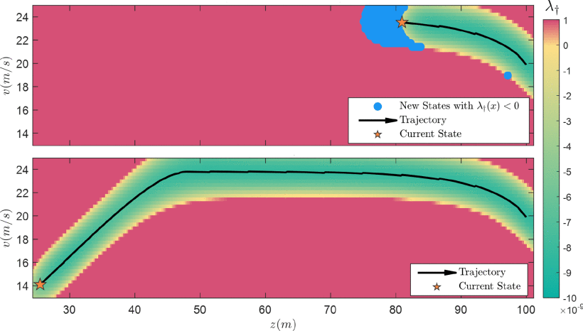 State-space illustration of the adaptive cruise control (ACC) scenario demonstrating the core idea of the authors' method. The black curve shows the system trajectory up to the current state (marked by a star). The colored background visualizes the feasibility certificate λ†(x) of the probabilistic CBF constraint, computed from the Gaussian Process posterior over the CBF dynamics. Regions where λ†(x) < 0 denote certified safe states (shown in green and yellow) given the dataset of measurements collected up until that point. In the top plot, as the vehicle approaches a boundary where uncertainty threatens this condition, the algorithm triggers an active measurement along an exploratory, safety-informed control direction, expanding the certified safe region with new states (in blue). As new data accumulate, this safe region continues to expand, enabling progression into states that were previously too uncertain. This adaptive interplay ensures the controller never leaves itself without a guaranteed safe backup direction, thereby maintaining recursive feasibility of the probabilistic CBF constraint. The bottom plot shows the final snapshot after completing the trajectory, highlighting the enlarged certified safe region resulting from the collected measurements.