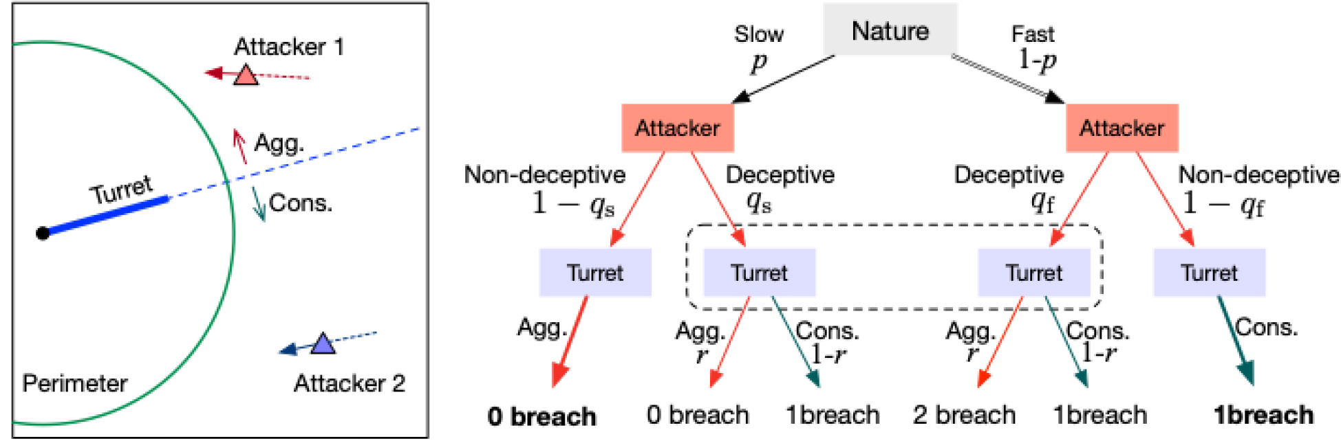 Illustration of the Turret–Attacker differential game in continuous time/space (left) and its corresponding information game in extensive form (right). The dashed box indicates the Turret’s information set, where it cannot distinguish whether it is facing a slow or fast attacker and must therefore guess. In this incomplete-information setting, attackers can deliberately adopt a slower (deceptive) movement to induce a dilemma, improving their expected number of breaches. This behavior contrasts with the complete-information setting, where slower movement is strictly suboptimal.