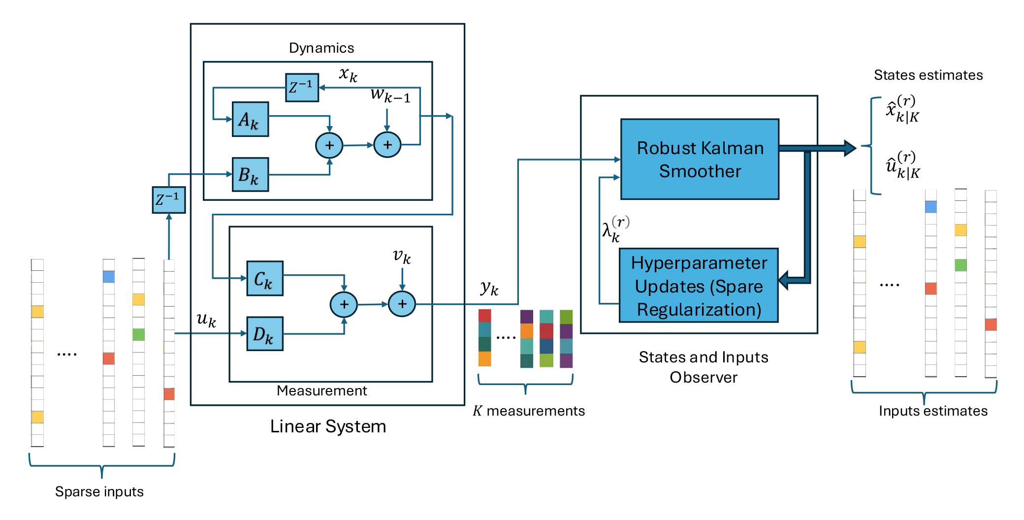 Schematic illustration of sparse inputs applied to a linear system that generates compressive measurements. The proposed observer processes a block of measurements and reconstructs the states and sparse inputs by iteratively alternating between Kalman smoothing and sparse prior hyperparameter tuning.